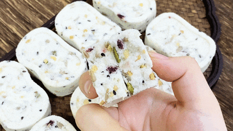 市面上大多数八珍糕干巴巴的,吃一口得喝三口水才能顺下去,这是因为采用热加工,不仅影响口感,营养物质也流失了。李时珍出品的田陌上八珍糕古法手工制作,采用冷加工,口感软糯,还能更好保留食材营养精华。从选材、浸泡、煎煮,再到收糕,每一步工艺都需要反復的尝试和打磨。为了保证口感,每一款食材都经过单独处理,研磨成不同粗细的颗粒后,再经过仔细混合均匀。