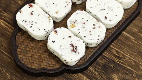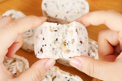 然后将食材灌入专门定制的模具压实呈长方形条块状,压制成型并让其自然冷却。老人小孩放心吃