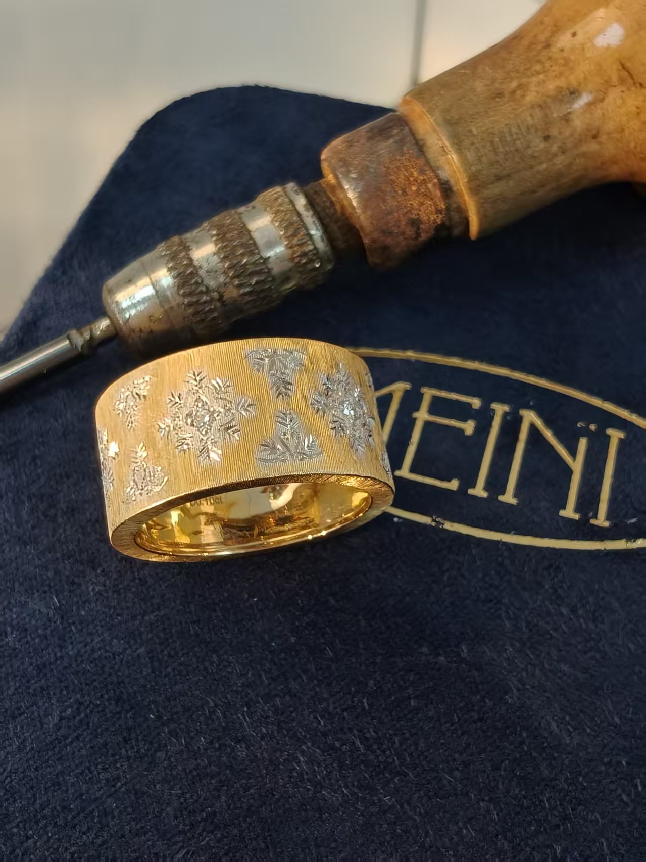然后剩下的织纹雕金,也是布契拉提最富盛名的工艺,他们的Rombi和Macri这两个系列基本上都是由剩下这个工厂---meini来完成的。