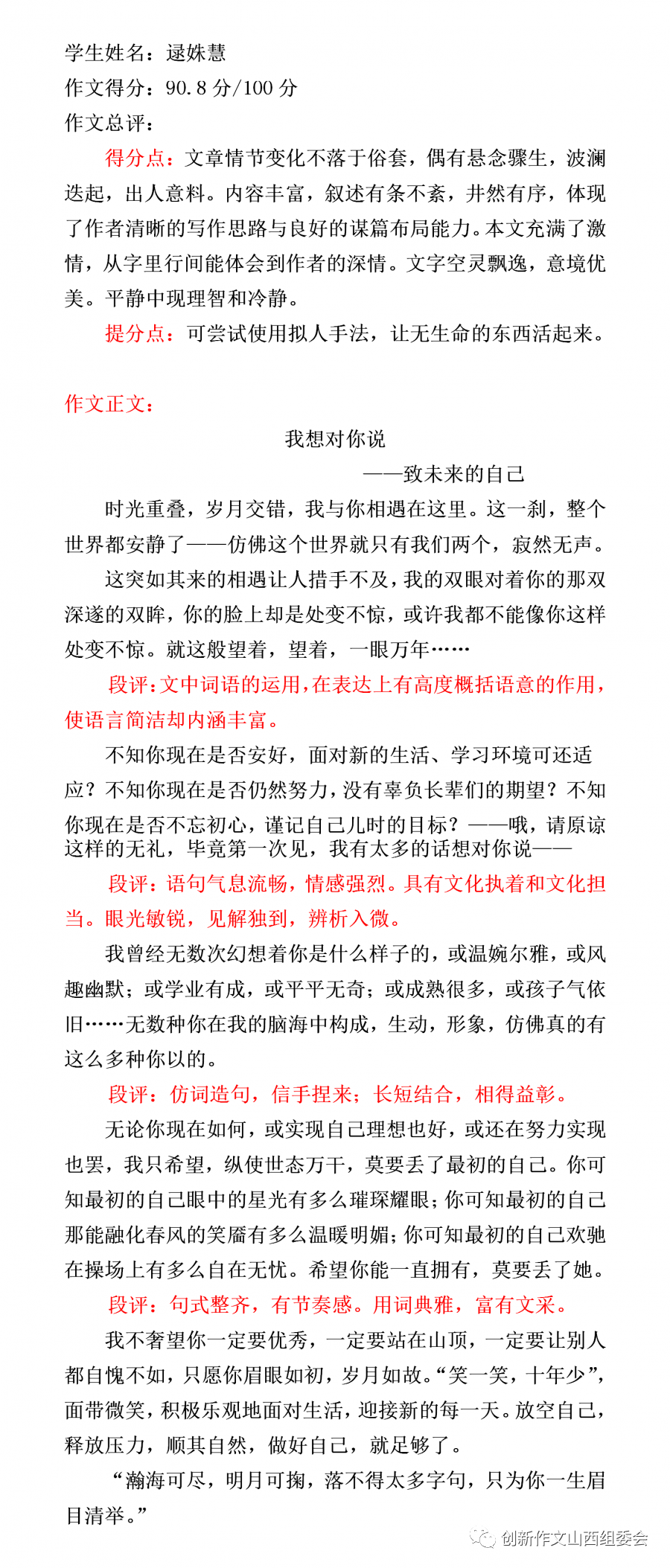 假如与未来的自己相遇,你会说些什么呢?一起来品读逯姝慧同学对未来的自己的“叮嘱”吧。