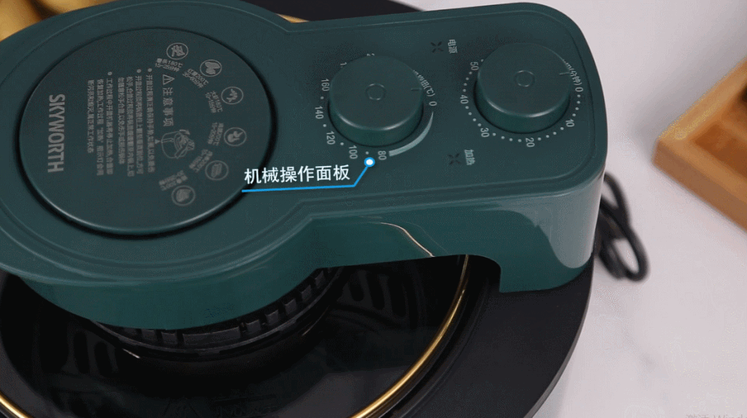 这款空气炸锅内置微动开关,打开玻璃盖,机器会自动断电。