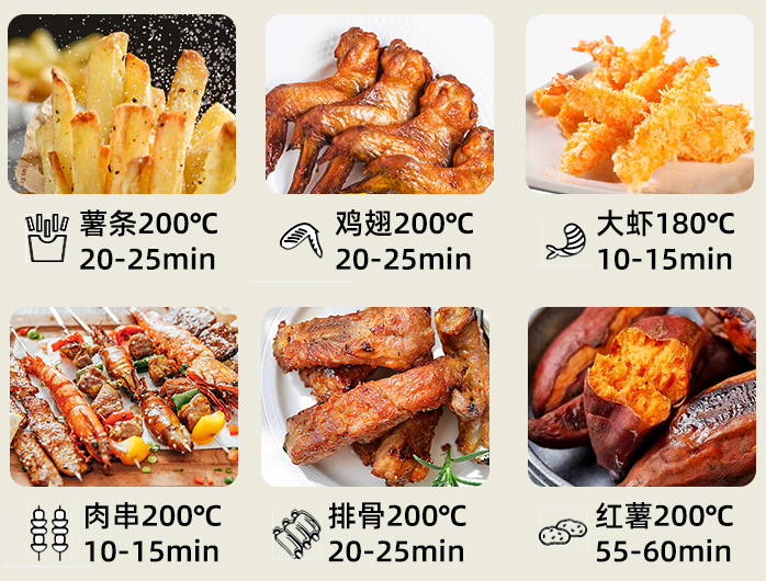 机器上还印有地瓜、肉类、薯条、海鲜、甜品等常见美食所需时间和温度。