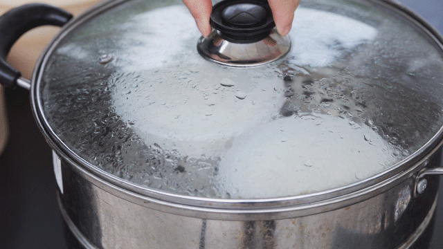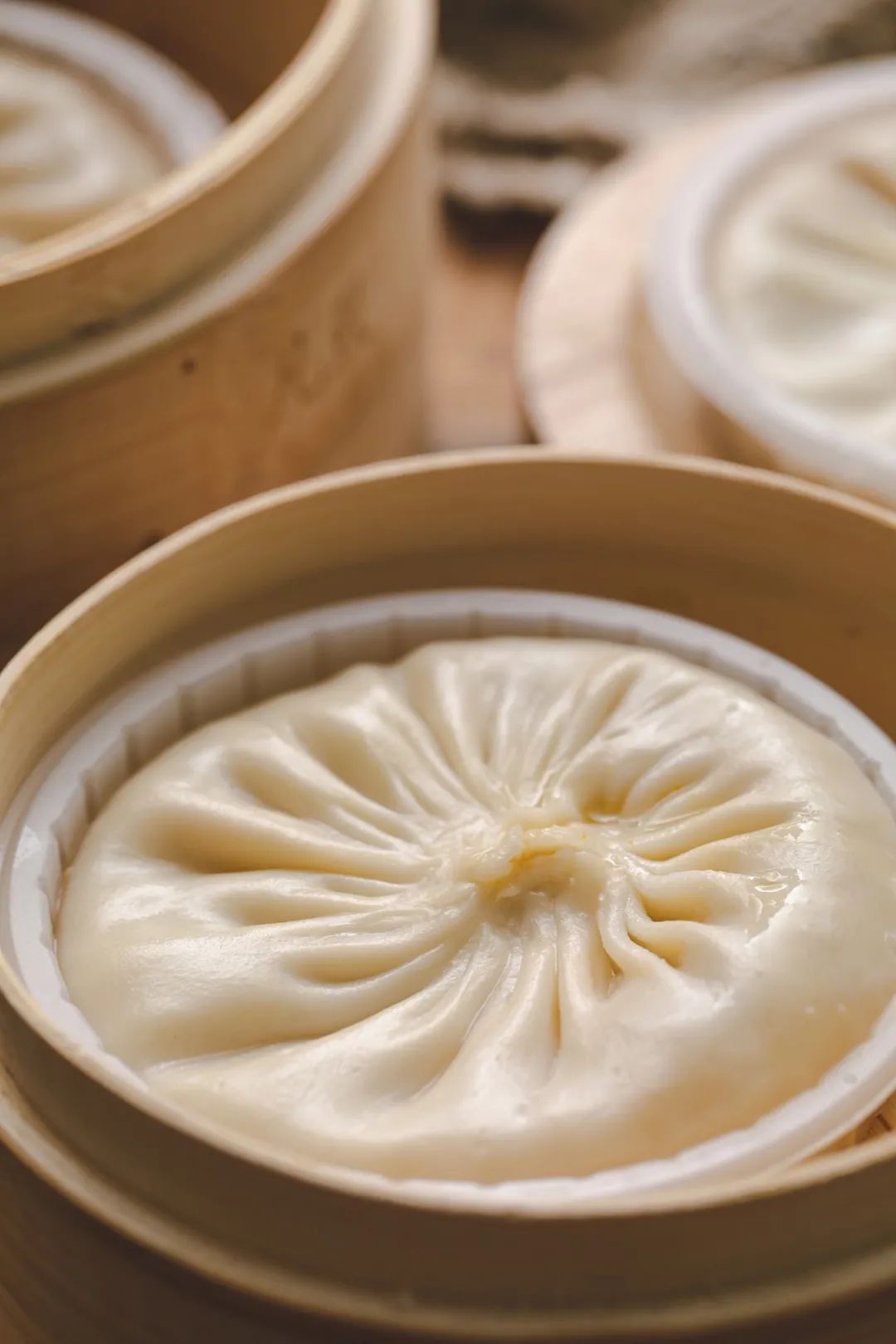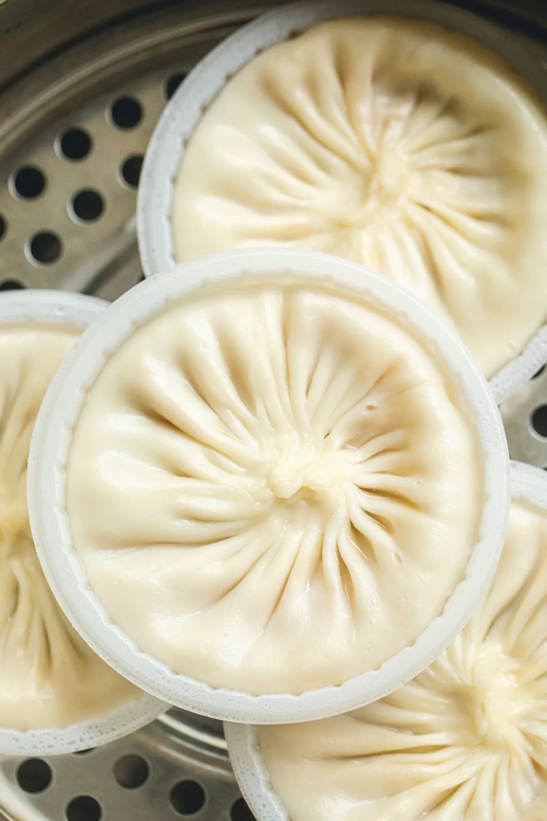 蒸好的蟹黄汤包,热气腾腾,开盖就是诱人的香气