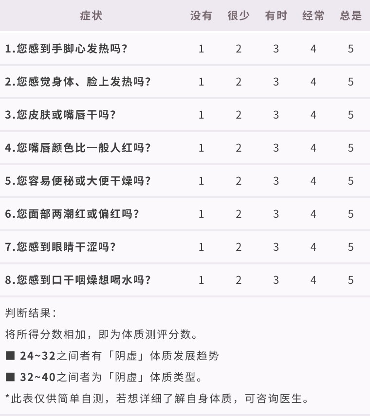 阴虚体质,是指当脏腑功能失调时,易出现体内阴液不足,阴虚生内热的证候,常表现为形体消瘦,两颧潮红,手足心热,潮热盗汗,心烦易怒,口干,头发、皮肤干枯,舌干红、少苔,甚至光滑无苔,多因燥热之邪外侵、过食温燥之品、忧思过度、房事不节、久病之后而发病。