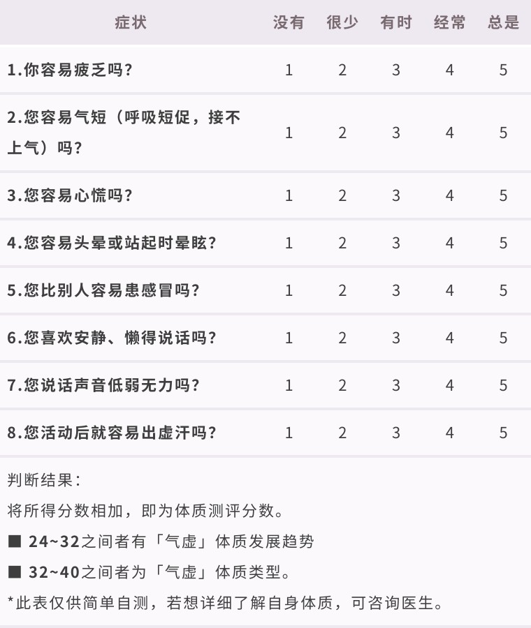 气虚体质,是指当人体脏腑功能失调,气的化生不足时,易出现气虚表现,常表现为语声低微,形体消瘦或偏胖,面色苍白,气短懒言,精神不振,体倦乏力,常自汗出,动则尤甚,舌淡红,舌边有齿痕,苔白,脉虚弱,因各种病因而发病,因心肺脾肾气虚部位不同而并见不同的症状。