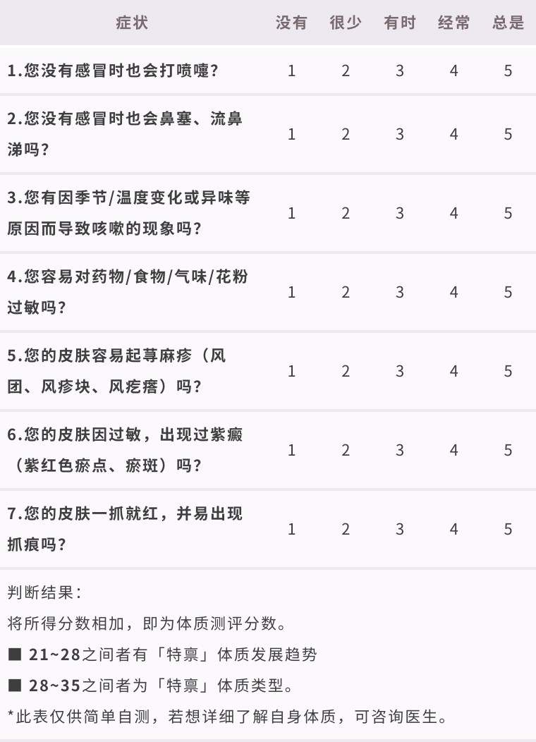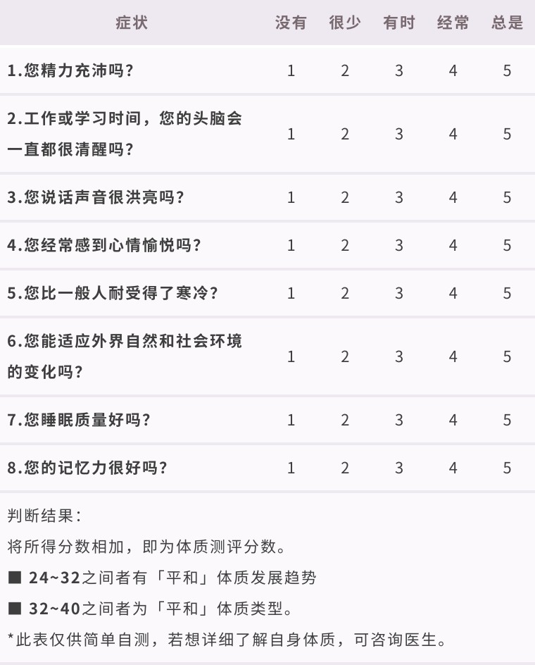 那么,不同体质的人有什么典型特征呢?下面,大家可以根据自己的情况,测试一下,您到底属于哪种体质?