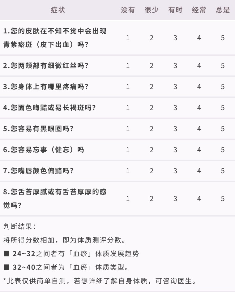 血瘀体质,是指当人体脏腑功能失调时,易出现体内血液运行不畅或内出血不能消散而成瘀血内阻的体质,常表现面色晦黯,皮肤粗糙呈褐色,色素沉着,或有紫斑,口唇黯淡,舌质青紫或有瘀点,脉细涩。多因七情不畅,寒冷侵袭,年老体虚、久病未愈等病因而发病,常随瘀血阻滞脏腑经络部位不同而出现不同的症状。