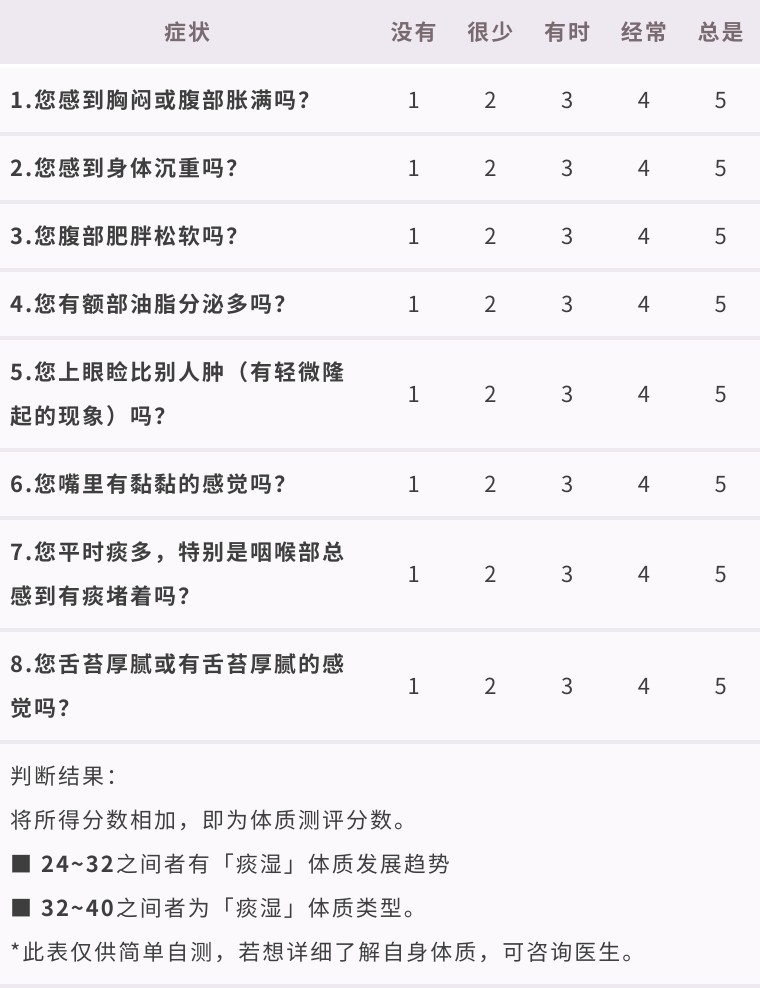 痰湿体质,是指当人体脏腑功能失调,易引起气血津液运化失调,水湿停聚,聚湿成痰而成痰湿内蕴表现,常表现为体形肥胖,腹部肥满,胸闷,痰多,容易困倦,身重不爽,喜食肥甘醇酒,舌体胖大,舌苔白腻,多因寒湿侵袭、饮食不节,先天禀赋、年老久病、缺乏运动而发病,常随痰湿留滞部位不同而出现不同的症状。