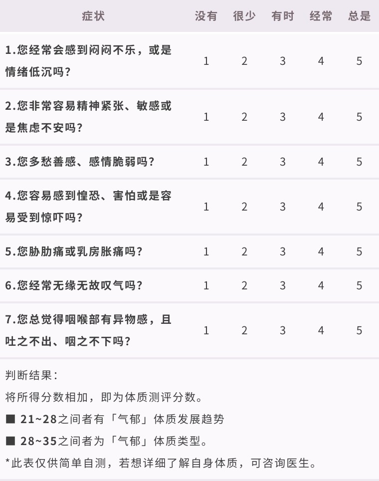 气郁体质,是由于长期情志不畅、气机郁滞而形成的以性格内向不稳定、忧郁脆弱、敏感多疑为主要表现的体质状态。处于这种体质状态者,多见于中青年,以女性多见,性格多孤僻内向,易多愁善感,气量较狭小。气郁体质者的发病以肝为主,兼及心、胃、大肠、小肠。易伤情志及饮食,易产生气机不畅,如郁病、失眠、梅核气、惊恐等,现代研究此类体质易生肿瘤。