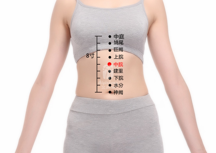 位于人体上腹部,前正中线上,当脐中上4寸。可治疗缓解腹胀,呕吐,泄利,便秘,胁下坚痛,头痛,失眠,惊悸,产后血晕等不良症状。