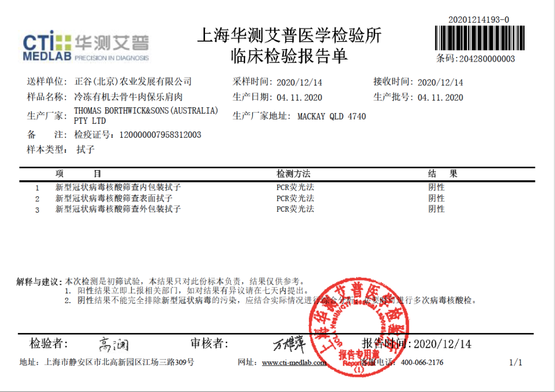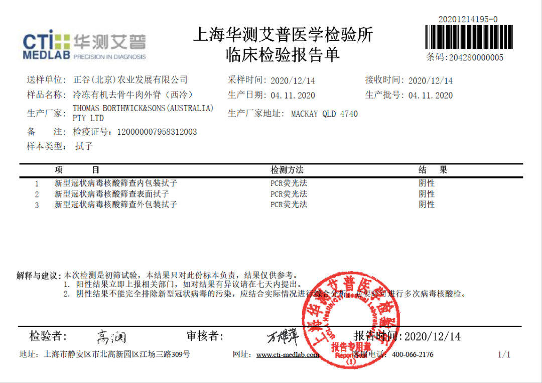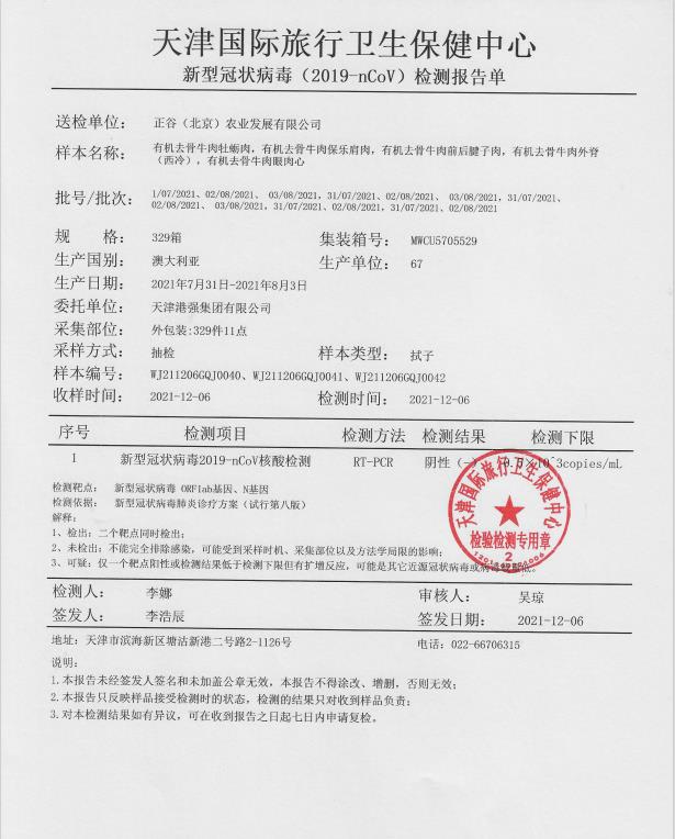 正谷有机牛肉来自正谷标准澳大利亚合作农场,现供应种类为牛肩、牛腱、西冷、牛眼,所有产品溯源检测报告、新冠核酸检测结果报告均合格,具体信息如下,供您查看。