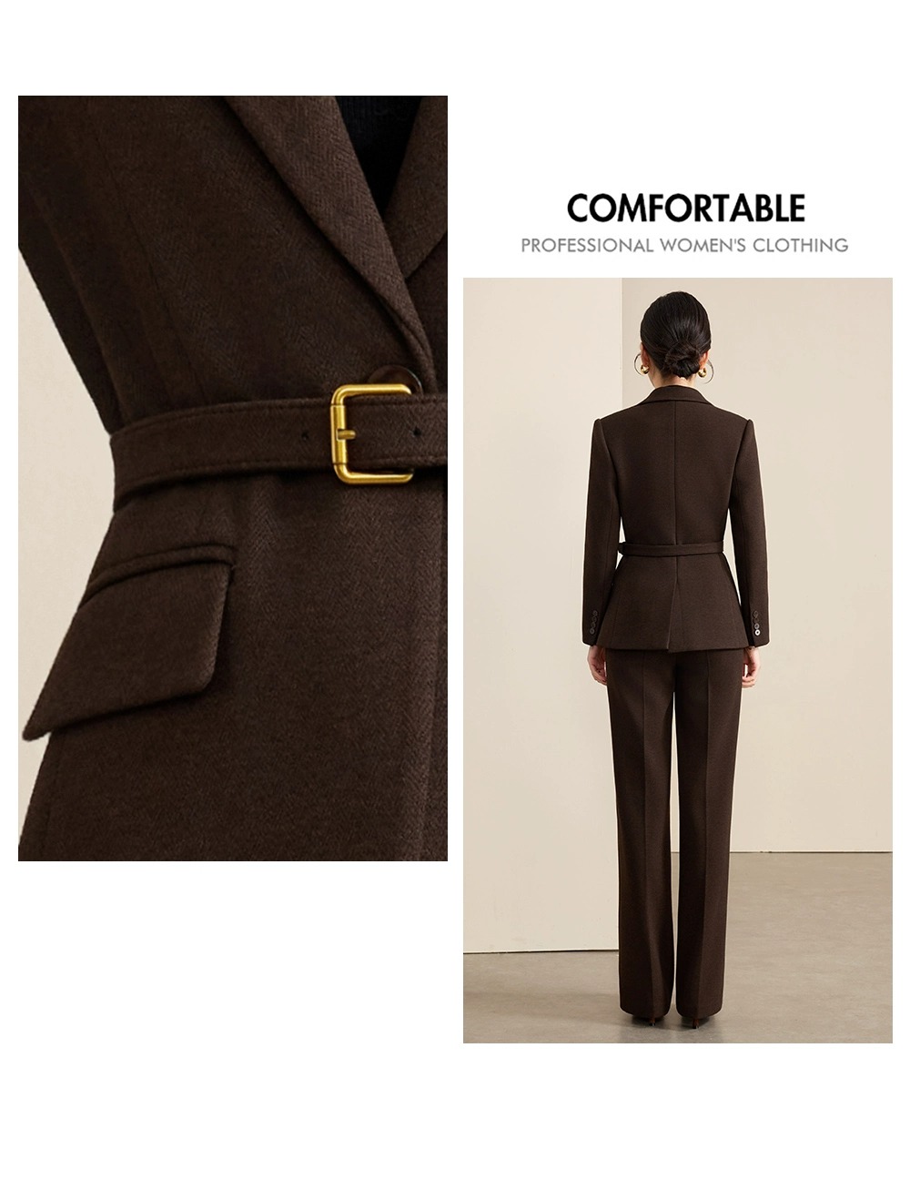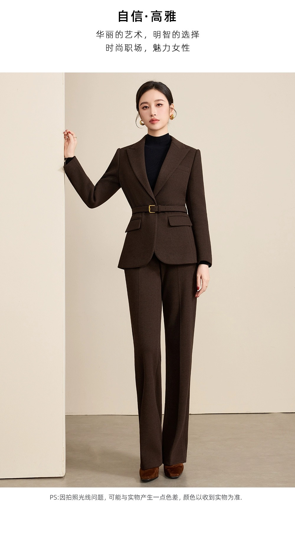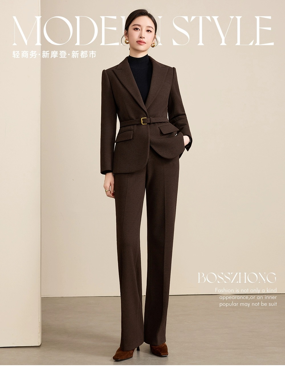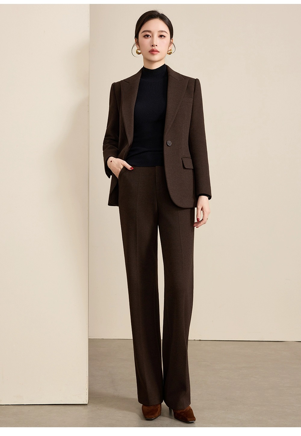 深咖色是秋冬的「质感容器」,毛呢是老钱风的「气质载体」——这套西装,让你在「职业感」与「贵气感」之间,找到最舒服的平衡点。