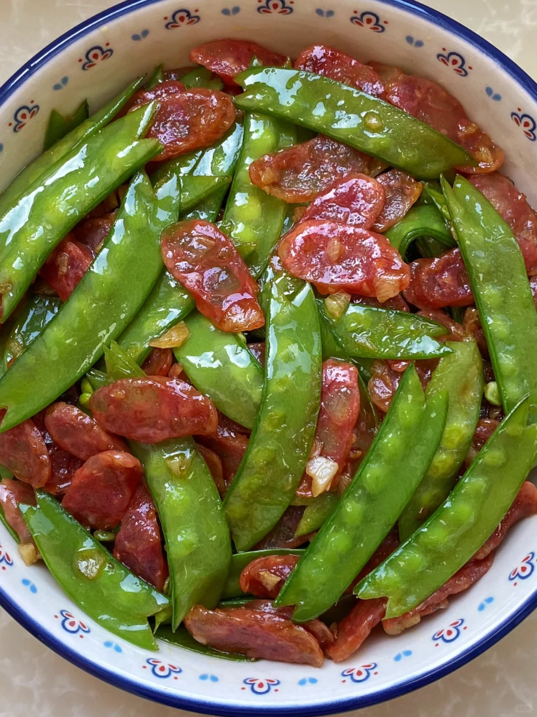 新手小白有手就会,放腊肠炒一会出油,再放进荷兰豆,等荷兰豆变色后2-3分钟即可出锅,荷兰豆脆脆的,腊肠出油后晶莹剔透, 感觉立马达到了外面堂食的水平,使人瞬间开胃了起来!