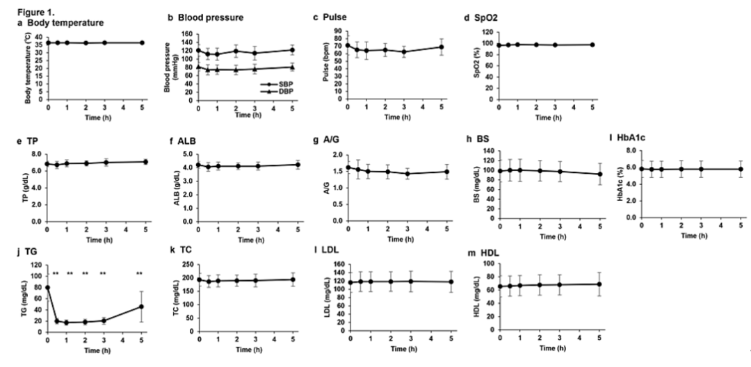 静脉输注NMN后0.5、1、2、3和5小时的体温、收缩压、舒张压、脉搏和血氧饱和度分析显示,输注前后所有参数均无显著差异(下图a-d)。静脉输注NMN后0.5、1、2、3和5小时,未观察到对血浆蛋白水平和葡萄糖代谢的显著影响(下图e-i)。尽管低密度脂蛋白、高密度脂蛋白和总胆固醇水平在NMN静脉输注前和静脉输注后0.5、1、2、3和5小时没有显著差异(下图k-m),但甘油三酯水平在输注后0.5-5小时显著下降,5小时后尽管存在显著差异,但仍有恢复到输注NMN前水平的轻微趋势(下图j)。