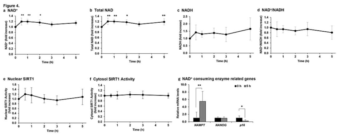 为了达到干预衰老的作用,NAD+应在其水平增加期间被sirtuin家族蛋白用作辅酶。因此,需要确定SIRT1是否能够通过静脉注射NMN而被激活。结果发现,静脉注射NMN后,核SIRT1的激活也增加,类似于NAD+合成的趋势(下图e)。在静脉注射NAD+之前和之后5小时,通过RT qPCR分析了血细胞中受SIRT1、PARP1和CD38激活转录调控的基因(下图g)。结果显示,输注NMN后NAMPT(一种通过SIRT1激活而改变mRNA转录的基因)的mRNA表达显著增加,p16(一种通过CD38激活而改变mRNA转录的基因)的mRNA表达显著降低。(p16是一种标志物基因,不仅能上调衰老,还能上调DNA损伤,它的降低也表明静脉注射NMN是安全的)