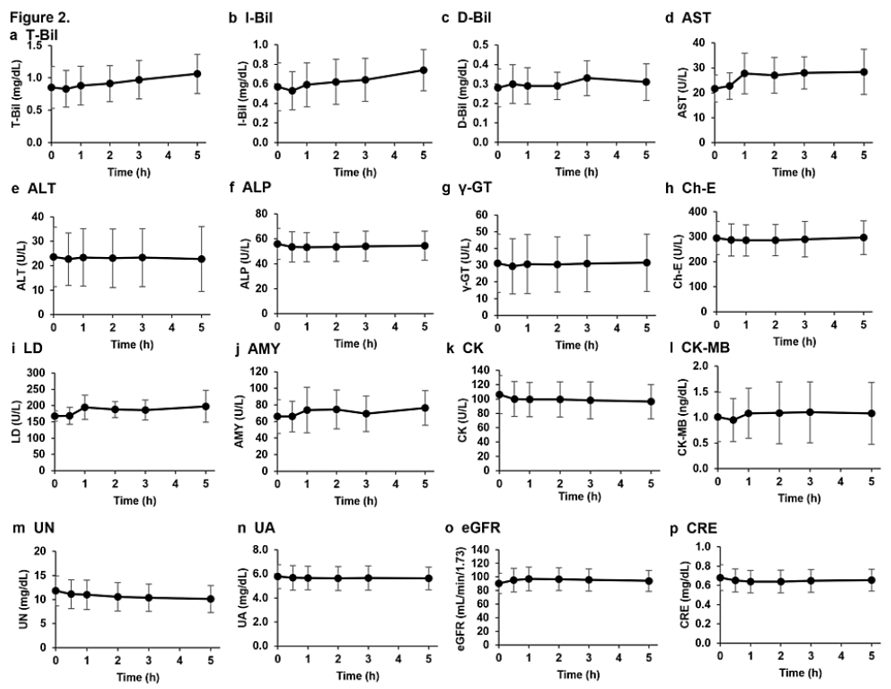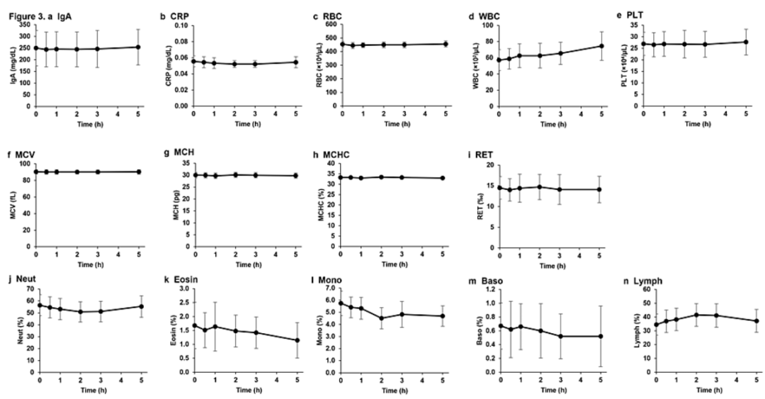 此外,对血液中红细胞、白细胞、血小板和相关标志物的分析显示,在静脉注射NMN之前和之后0.5、1、2、3和5小时没有显著变化(下图)。