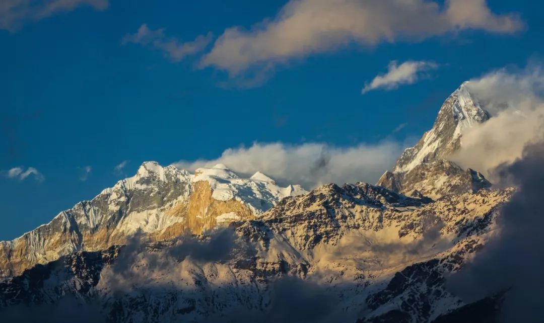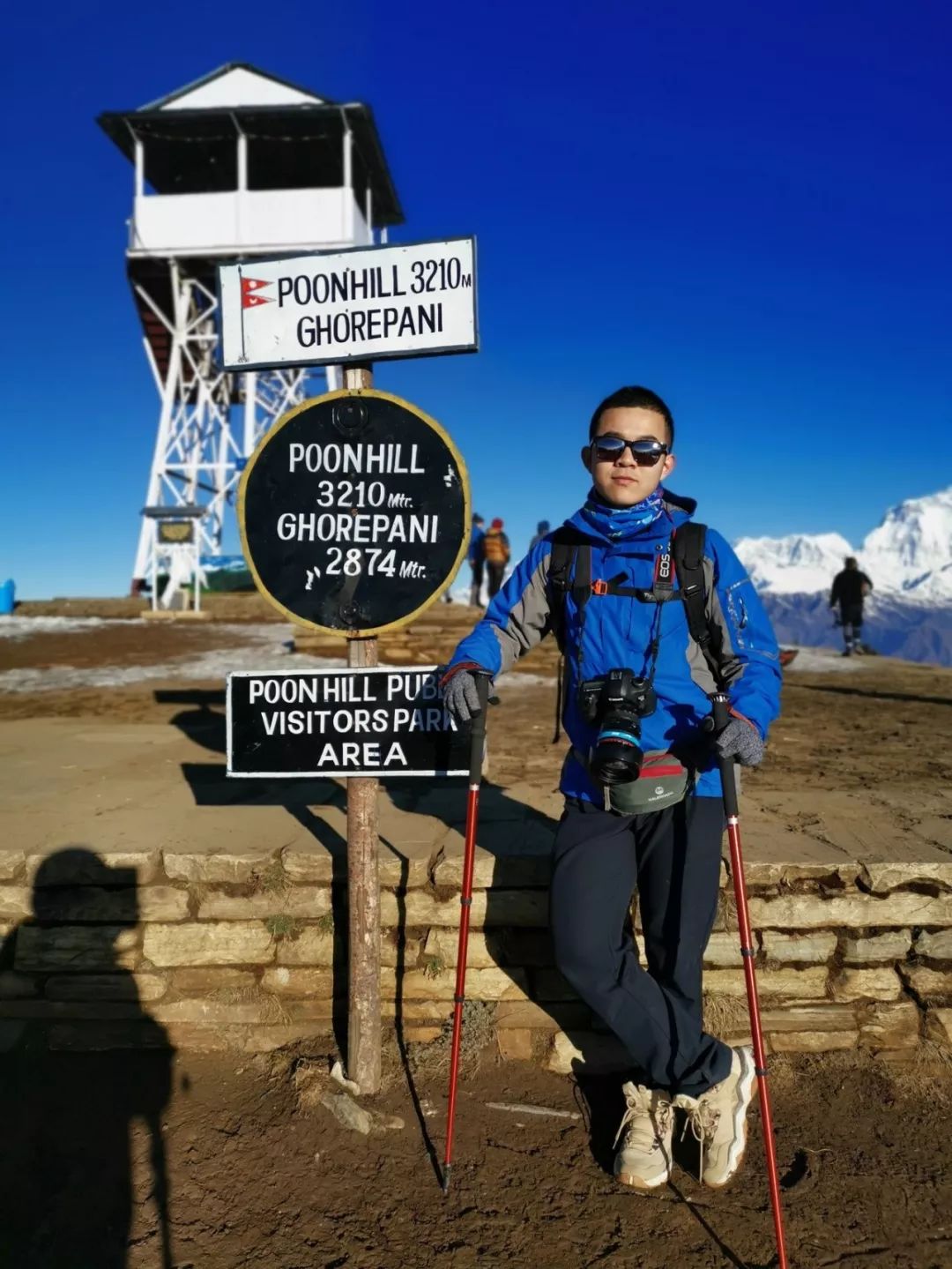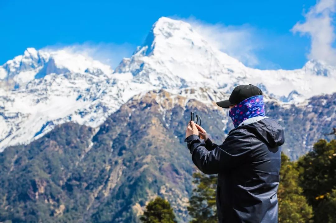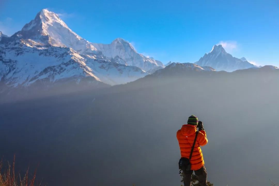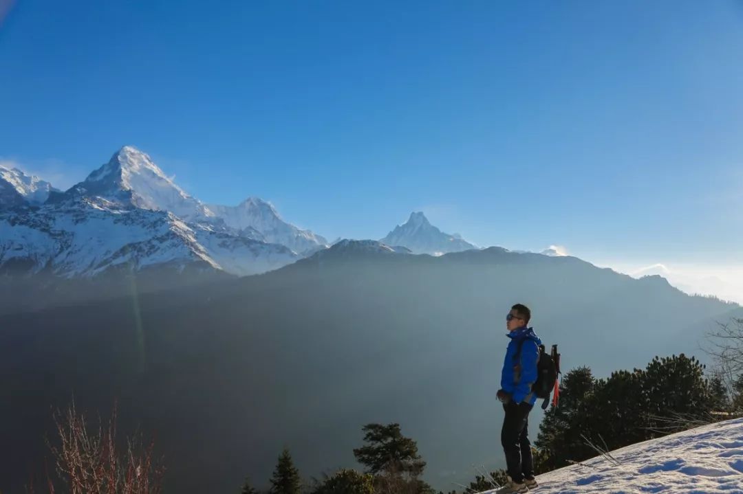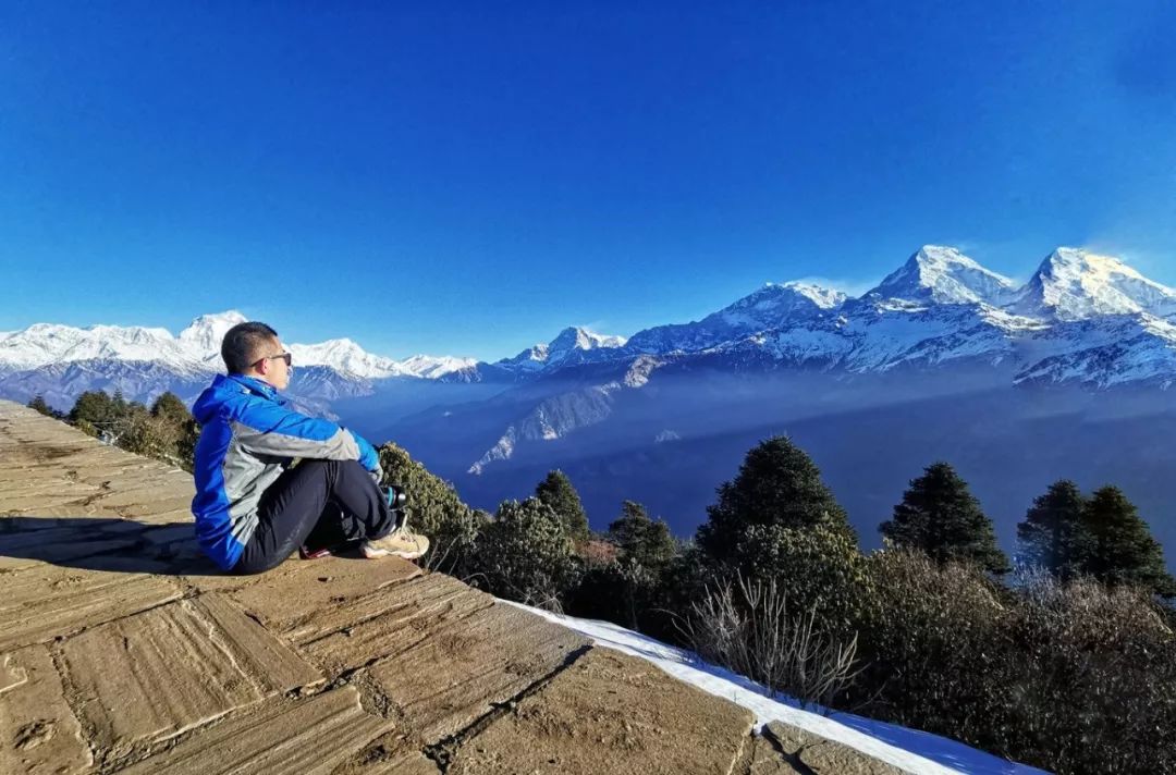在山顶可以看到喜马拉雅山脉中很多著名的雪山,安纳普尔纳峰 、鱼尾峰等,可能是我太喜欢雪山了,刚登顶时就各种瞎折腾,先是拿相机拍了很多照片,又把三脚架支起来拿手机录延时,之后又自拍几张,接着去拍风景,一直循环,因为这里真的很美...