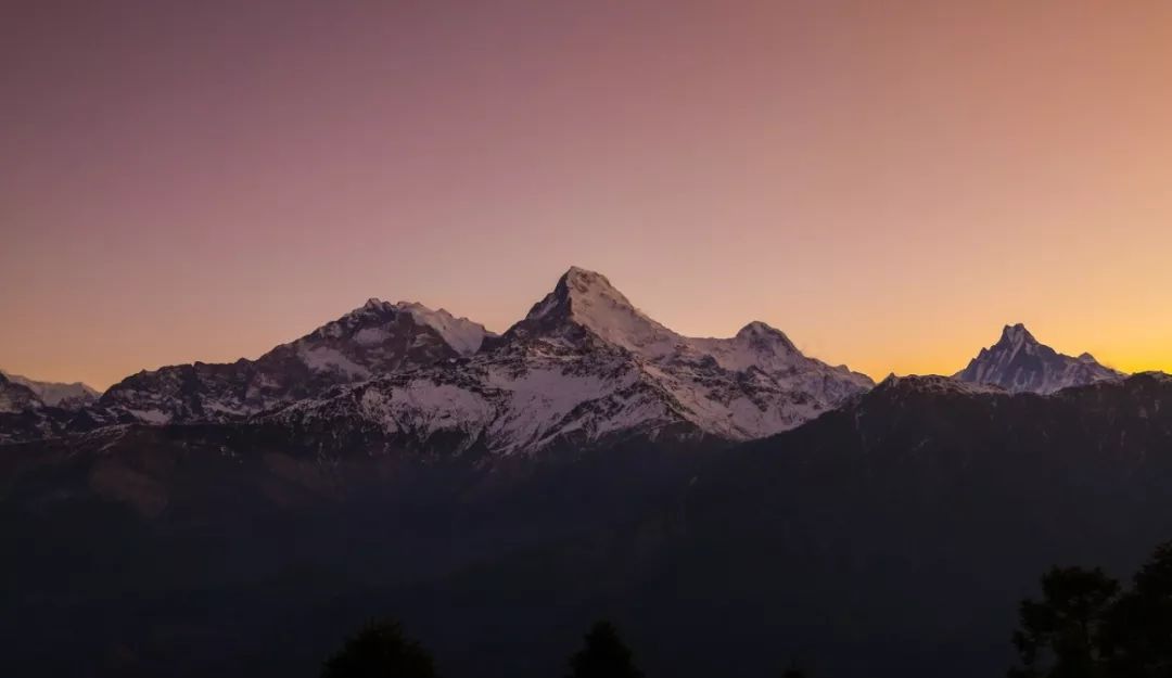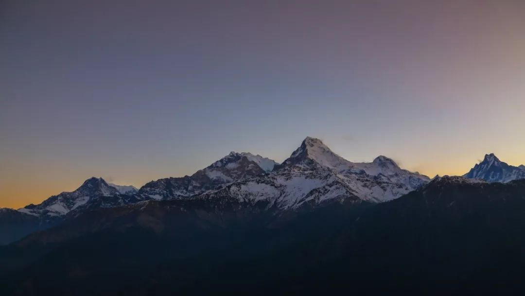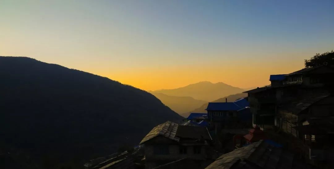躺了一会准备去餐厅吃饭,因为山上客栈都是无敌开阔式山景房,所以每个角落基本都能看到风景,餐厅也不例外。这不,吃饭的时候正巧是日落时间,我目睹了太阳从天上到完全消失的全过程,当太阳的余光照在安纳普尔纳山脉上时,我感叹到,来这一次,值了。