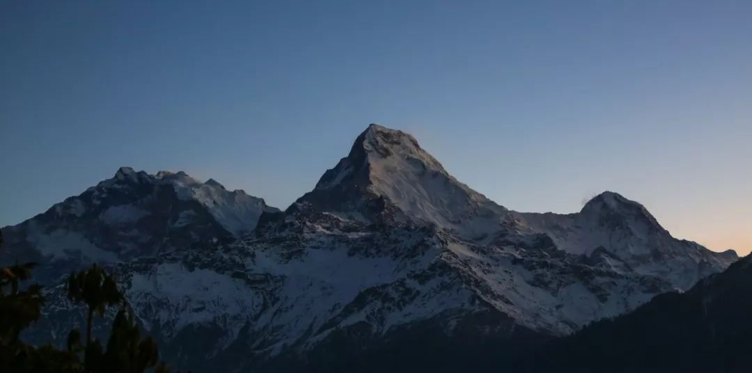 因为天没有亮,我一直开着头灯行走,两边漆黑一片,是悬崖还是树丛根本看不清,就这样摸黑走了好久。大概过了 40 分钟左右时,远处的鱼尾峰,开始冒了金黄色的光,传说中的日照金山?被我赶上了?