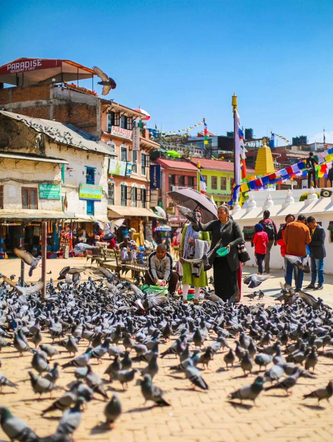 在圆佛塔顶出那一双巨大的眼睛仿佛就在静静的注视这个世界的一切,不知是哭还是在笑,眼睛里也好像写满了故事,而信徒们在塔底下以顺时针的方式拨念珠和背诵经文。