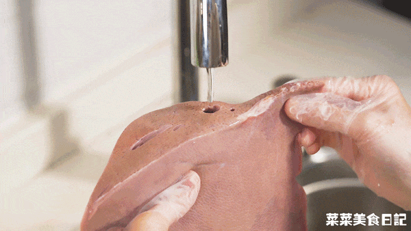 1.新鲜猪肝找到大动脉孔位,用流动的清水灌入孔洞内灌洗10分钟去血水,再用清水浸泡2小时,得到粉嫩白净的猪肝