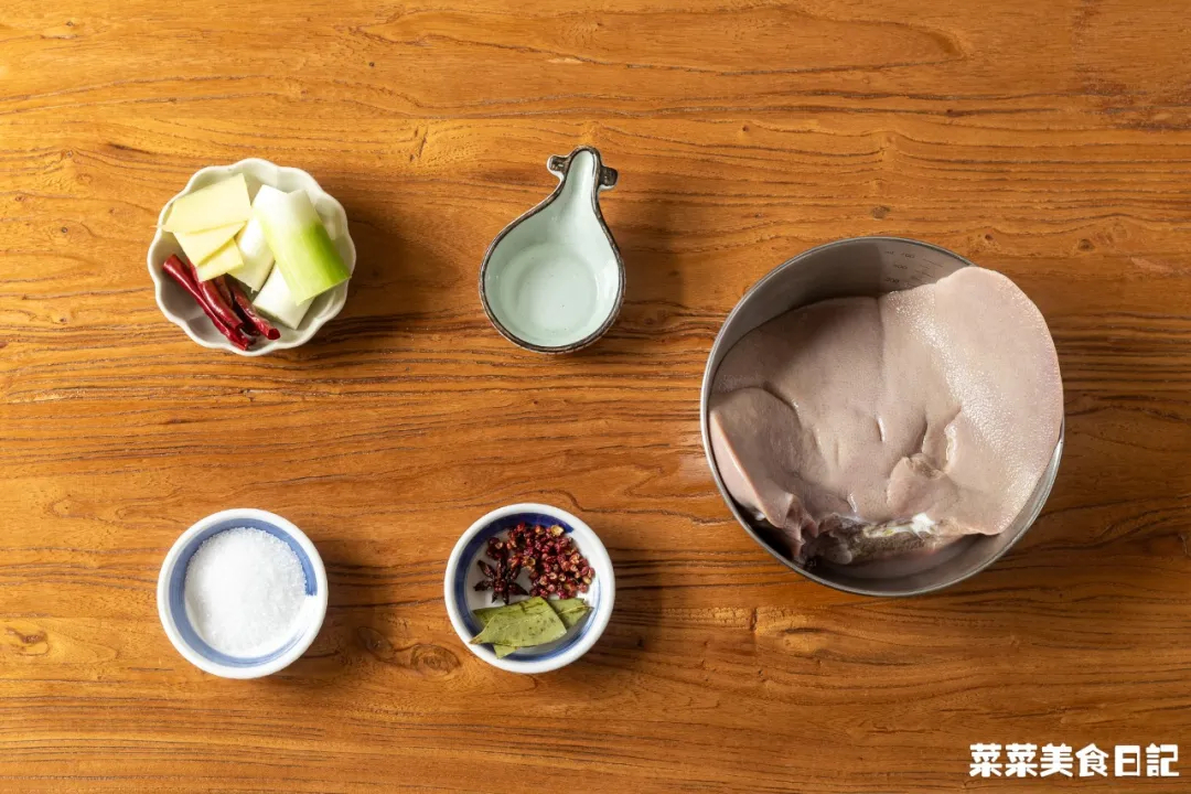 4.将猪肝放入电饭锅中,加入800ml温水,15g盐、2g花椒、1片香叶、1颗八角,按保温键保温1小时关掉电源,开盖浸泡至完全晾凉,用筷子戳进去不出血水即可
