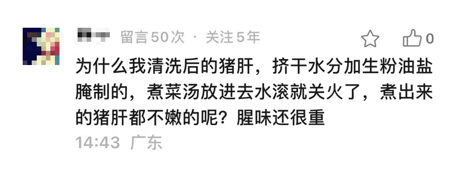 像这种情况,大概率不是处理手法的问题,而关乎食材本身。要是买到了新鲜的还好,简单处理一下,就能还原鲜嫩。可要是买了冷鲜的、市场案板上放久了的猪肝,那就不宜滚汤,得靠浓油赤酱才能盖住腥味。对腥味比较敏感的小伙伴,建议一早去市场买,选颜色均匀、表面光滑湿润、无斑点的,新鲜度会更好。粉肝的颜色偏棕褐,口感非常细嫩,通常是养了一年以上的猪才会有,遇到千万别错过。猪肝切片,加1小勺盐、1大勺香醋搅拌至发白,加清水泡5-10分钟,冲洗至无血水,便可以有效去除腥味。炒菜:提前拌料入味,下锅全程不停翻炒,变色后十来秒就能出锅。滚汤:焯10秒后捞起,撇开浮末重新入锅,煮至沸腾即可关火盛出。最近,我又尝试了一种新做法,口感比炒、煮的都更加惊喜!看这白白净净的肤色,几乎没有粉感颗粒的切面,是不是跟普通猪肝很不一样?它的口感可柔嫩着呢!甚至还能给大家表演一个“wave”~盐水猪肝,有点类似于白卤,调味非常精简,就盐和几样香料。蘸上酱料,更是直接变身开胃又百搭的凉拌菜,大热天吃太舒服了!只需要通过恒定低温+高时长的方法,使猪肝慢慢熟成,就能保持在最佳熟度。感觉有点耳熟?没错,就和以前做过的低温慢煮牛排类似。有点类似于牛奶常用的低温消毒法,不但能保证风味,更能有效杀死其中的各种生长型致病菌。入锅的猪肝,需要保持大块,就像卤牛腱子那样,先煮后切。这样内部的水分不会在烹饪过程中大量流失,吃起来口感更嫩、不噎人。不说比肩鹅肝,毕竟价差摆在那里,夸它一句“鹅肝平替”倒也完全没毛病!