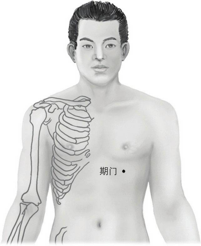 期门穴位于胸部,乳头直下,第六肋间隙,是肝经的穴位。取坐位或仰卧位,以左手中指指腹按揉胸部右侧期门穴半分钟,再以左手中指指腹按揉胸部左侧期门穴半分钟。
