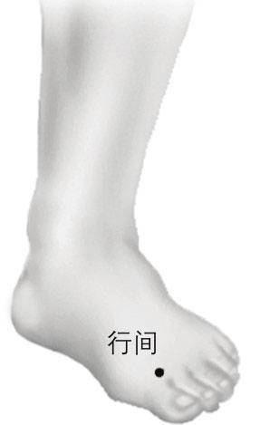 行间穴位于足背,第一二趾间缝纹端,是肝经的穴位。取坐位,以右手中指指尖按揉右脚上的行间半分钟,再以左手尖按揉左脚上的行间穴半分钟。