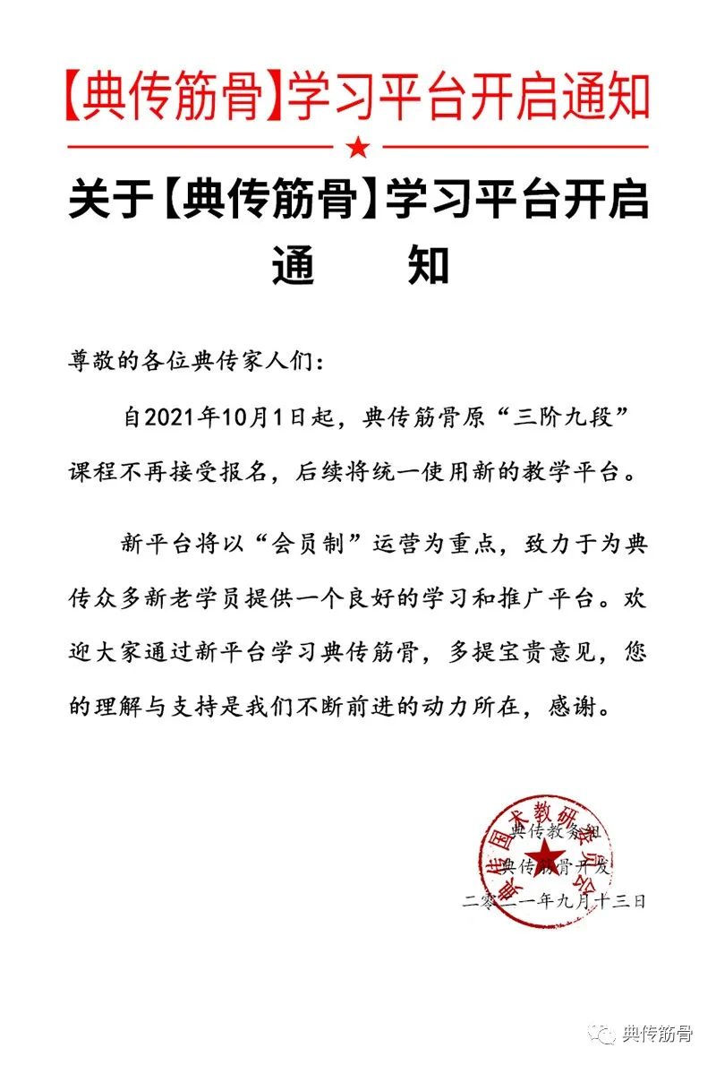 自2021年10月1日起,典传筋骨原“三阶九段”课程不再接受报名,后续将统一使用新的教学平台。