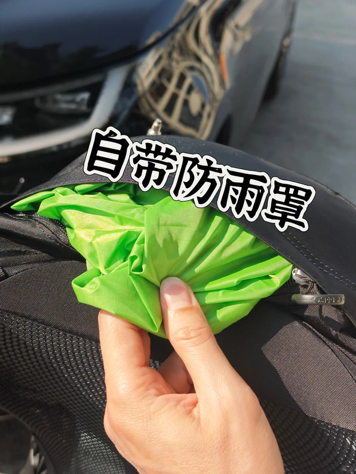 透气背板、水袋仓、袋鼠仓、眼睛仓等AIRSPEED 空速背负的悬浮式网面背板,更好的提供了透气背负舒适感3.底部内置防雨罩,下雨天也不怕。