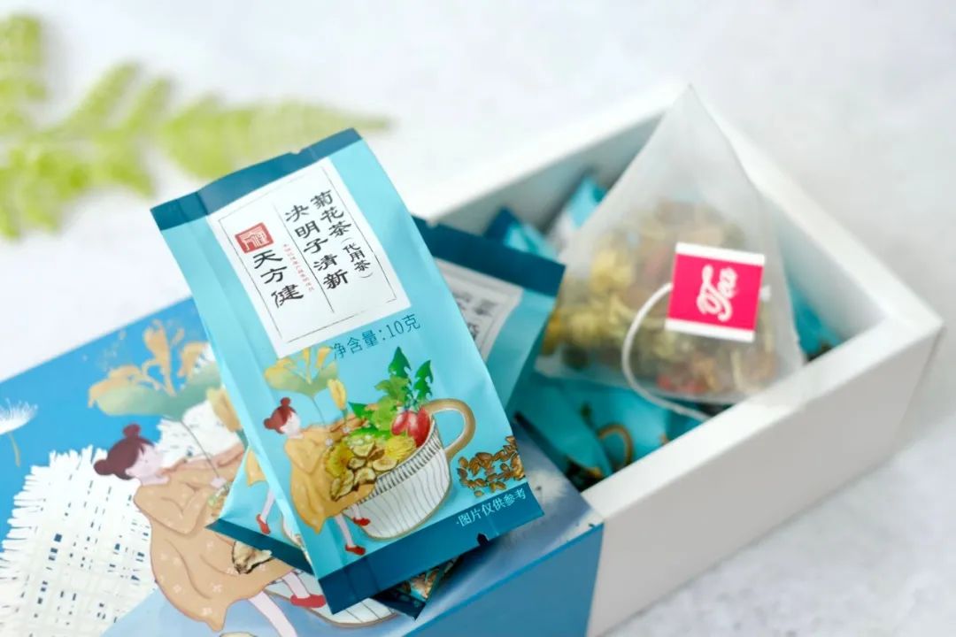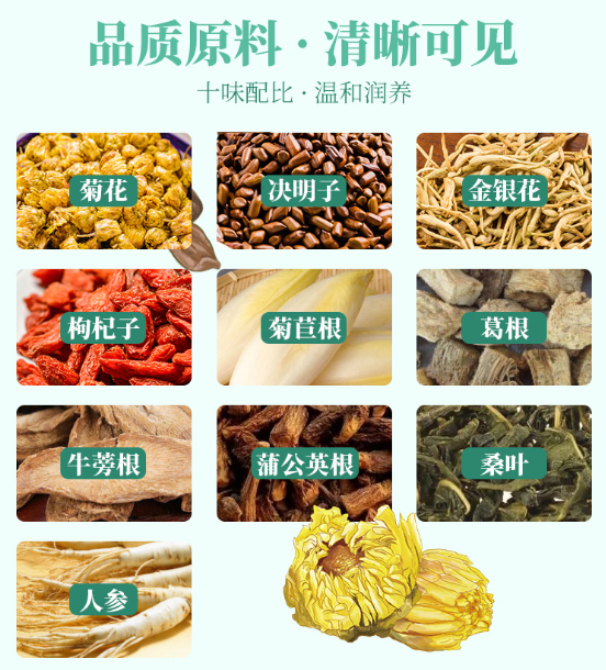 天方健新品「决明子清新菊花茶」,采用了十味道地药食,严苛选材、科学配比,组成一个药性更为全面的茶方。原料分别有:决明子、菊花、枸杞、菊苣根、葛根、牛蒡根、蒲公英根、金银花、桑叶、人参片。