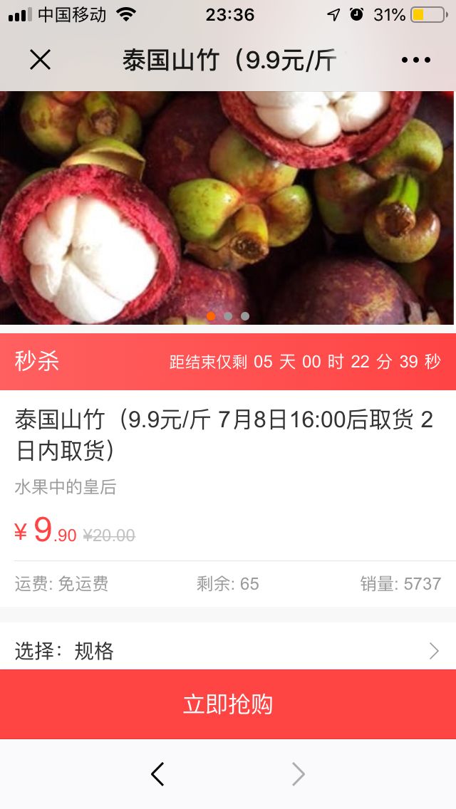 ② 对于季节性较强或单价较高的热销水果,不仅缩短秒杀时间,且折扣力度再次提升,以营造抢购氛围的方式,增加销量。如:山竹活动,原价 20 元/斤,现价 9.9 元/斤,折扣力度达到 5 折,单月销量突破到 5700 多份。