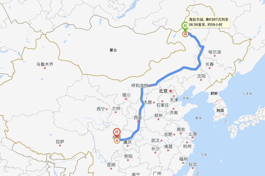▶线路:海拉尔-大雁-牙克石-免渡河-乌奴耳-博克图-扎兰屯-碾子山-龙江-富拉尔基-齐齐哈尔-大兴-泰来-白城-洮南-开通-太平川-宝龙山-通辽-开鲁-查布嘎-林东-大板-桑根达来-正镶白旗-商都-集宁南-呼和浩特东-包头-东胜西-榆林-绥德-安康-万源-达州-南充-成都