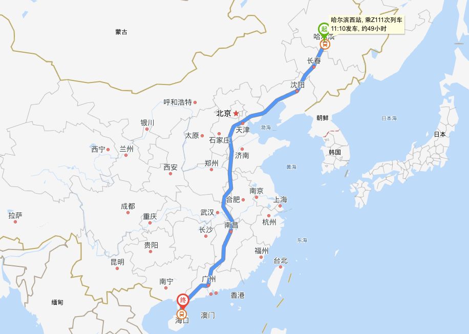 ▶线路:哈尔滨-长春-四平-沈阳北-锦州南-山海关-秦皇岛-北戴河-唐山-天津-任丘-衡水-聊城-商丘南-阜阳-潢川-麻城-九江-南昌西-吉安-赣州-韶关东-广州-佛山-肇庆-茂名-湛江西-徐闻-海口