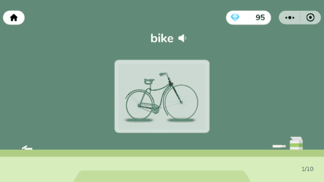 比如在复习单词“bike”时,先依次出现了3张自行车的图片,接着画面一变,让孩子点选正确的“bike”,答对了就有钻石奖励!光这一个游戏,就重复了四次读音。 值得注意的是,记单词的环节没有任何中文翻译的露出,直接上图像。