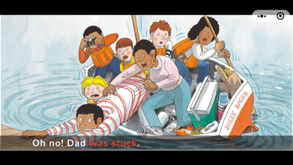 每本绘本,童老师都会把重点字词的使用讲得特别透,不仅不枯燥,还相当有趣,加上课程用心的动效音效,整个看起来像动画片! 比如《Nobody got wet》这个故事 ,讲的是一家人去湖心野餐的故事。故事的高潮,是爸爸推船时差点掉进水里。