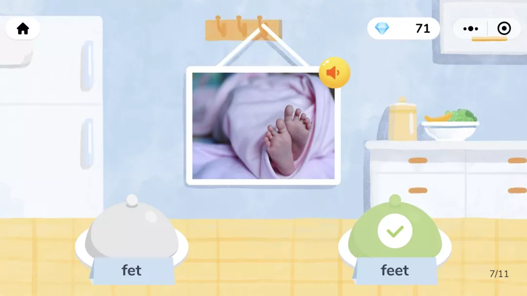 游戏的选项设计很用心,会把容易容易混淆的单词作为了“迷惑项”,比如feet 和 fet、funny 和 sunny,考察孩子是不是真的学懂了单词。