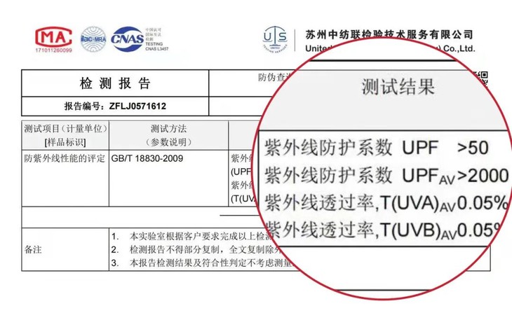(国家质检总局规定,UPF-紫外线防护系数>40,UVA-紫外线透过率<5%时,才能称为防紫外线产品。)