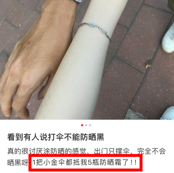 朋友去三亚玩了5天,每天撑着FIYU小金伞疯逛,同行的老公都黑成碳了,这姐从头到脚还是白到发光!直呼一把伞能抵5瓶防晒霜*!