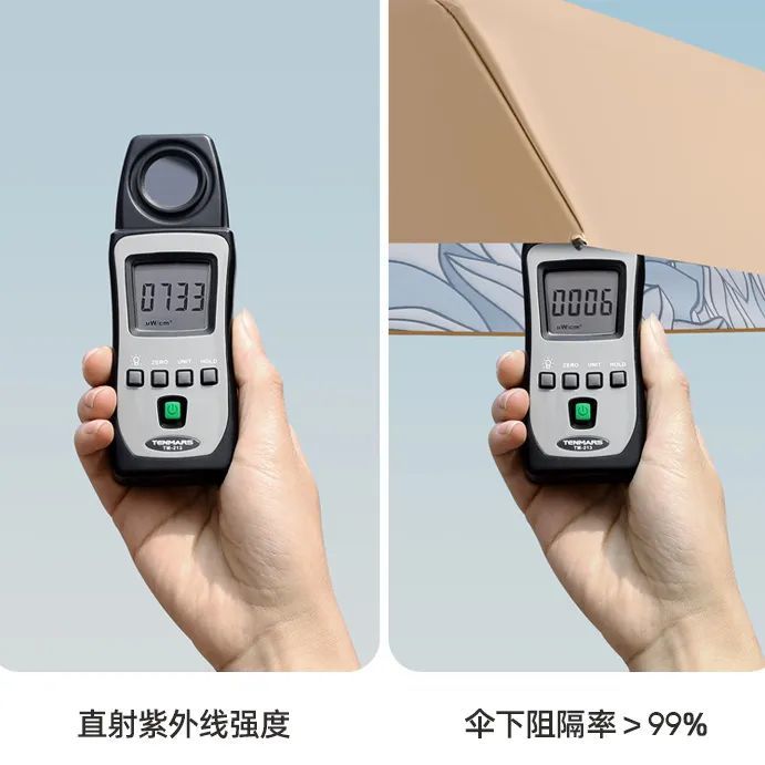同样阳光下,伞下紫外线从733降到006*!(*测试数据来源于品牌方)