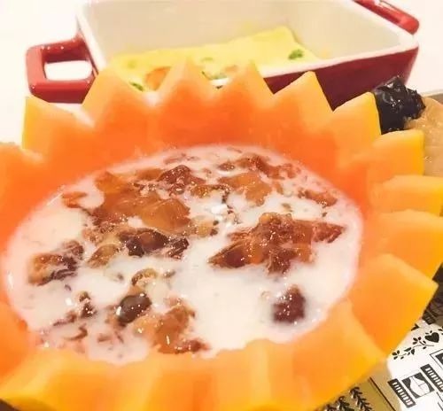 1.3、把桃胶放入到小碗中,入锅蒸制三十分钟,然后把木瓜切开,把蒸好的桃胶放入到木瓜中,然后放入冰糖,接着蒸制二十分钟,一份诱人的木瓜炖桃胶就做好了。