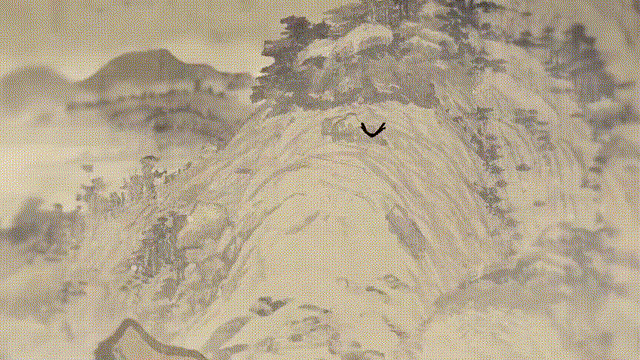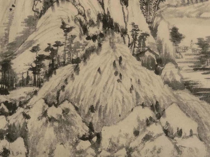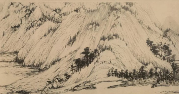 在画面上,画家进行了山水的层次感设计,山的前后是一种由近到远的排列,在构图方式上给予了前后景物的一种有效联系。