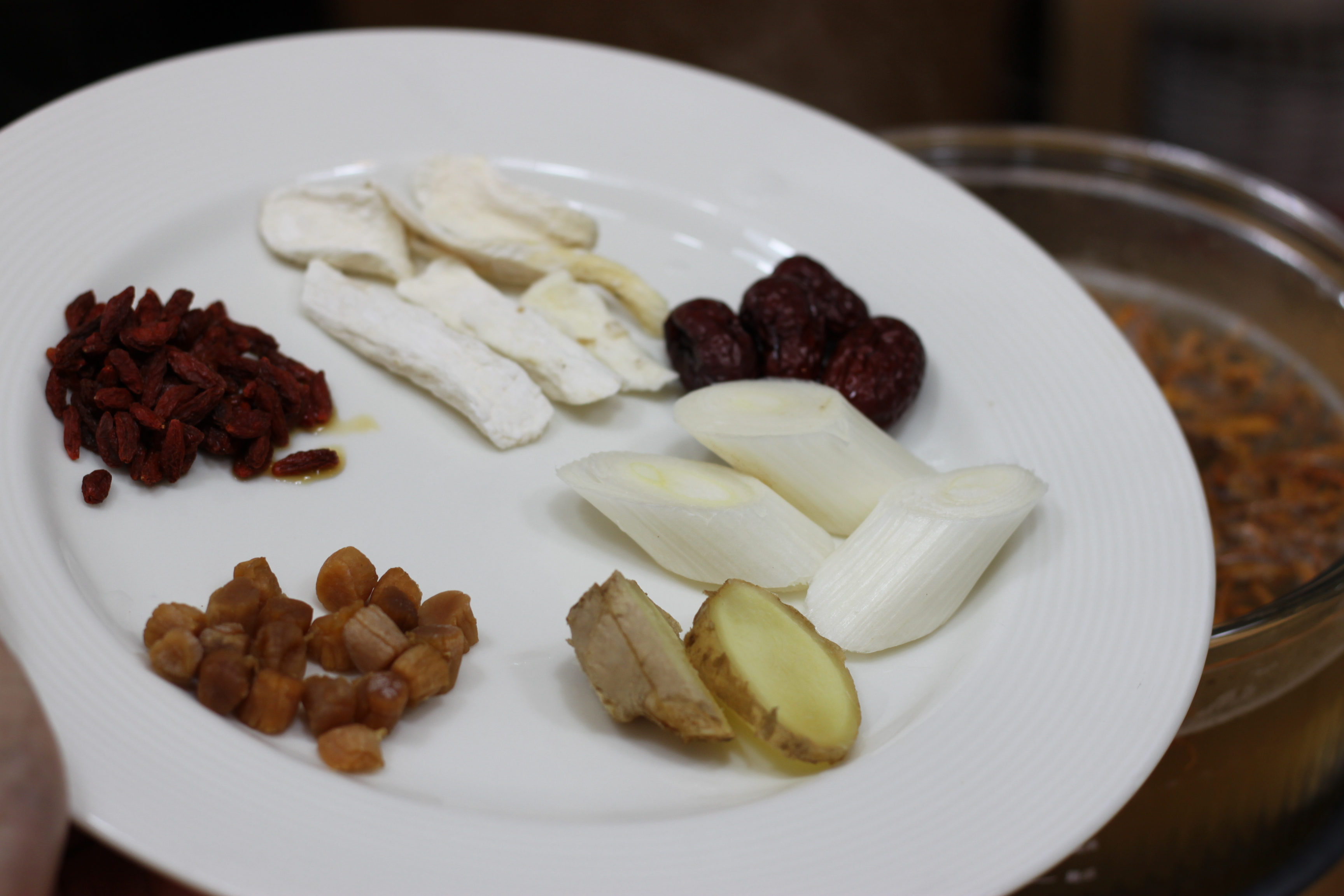 6. 加入干贝,山药,红枣,枸杞子,葱段,姜片,使用快煮功能烧开