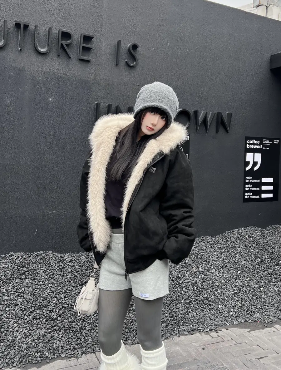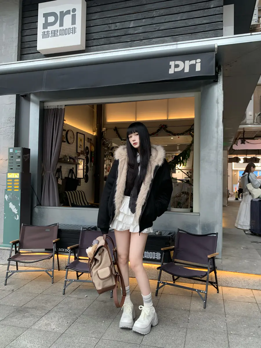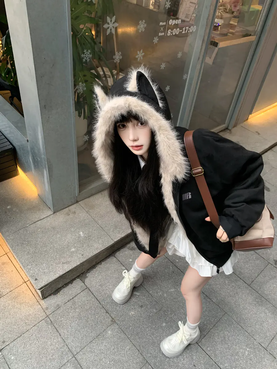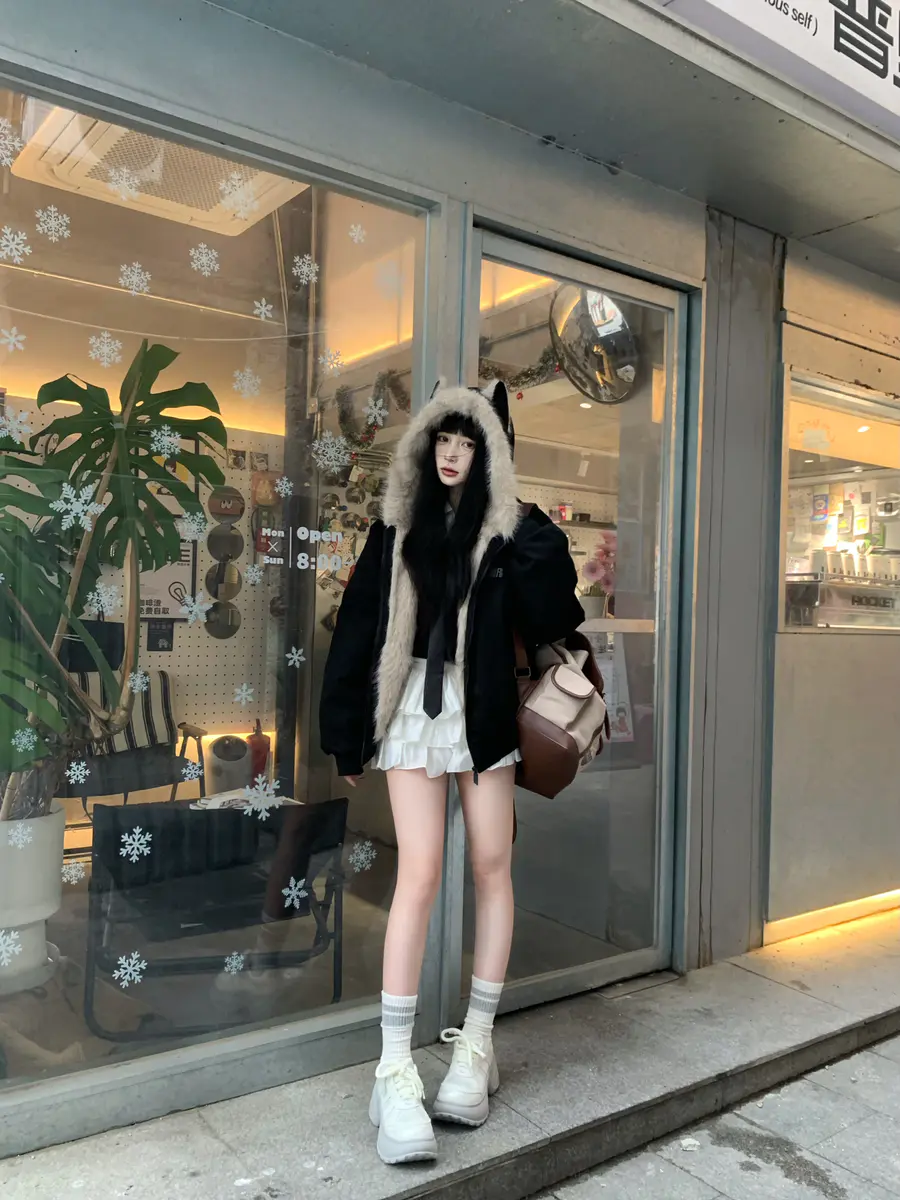 大毛领软乎乎的温暖和安全感直接拉满,耳朵小设计自带酷感,搭配白色蛋糕短裙好乖好甜~