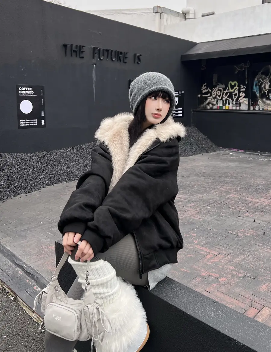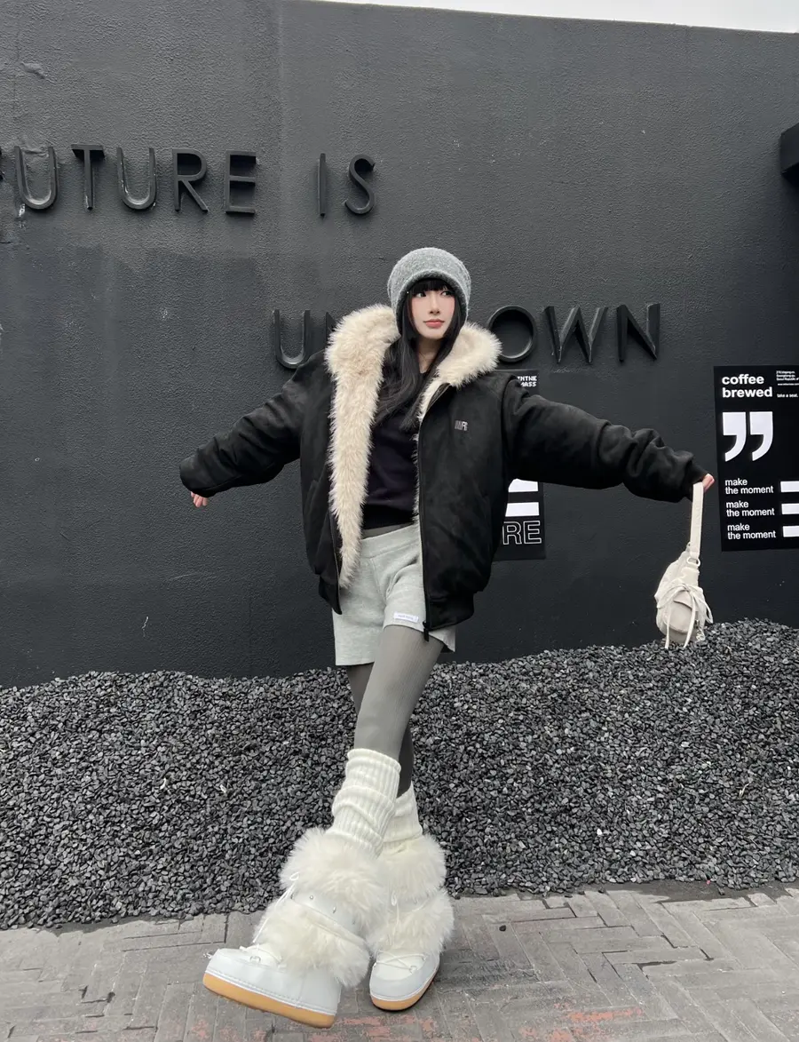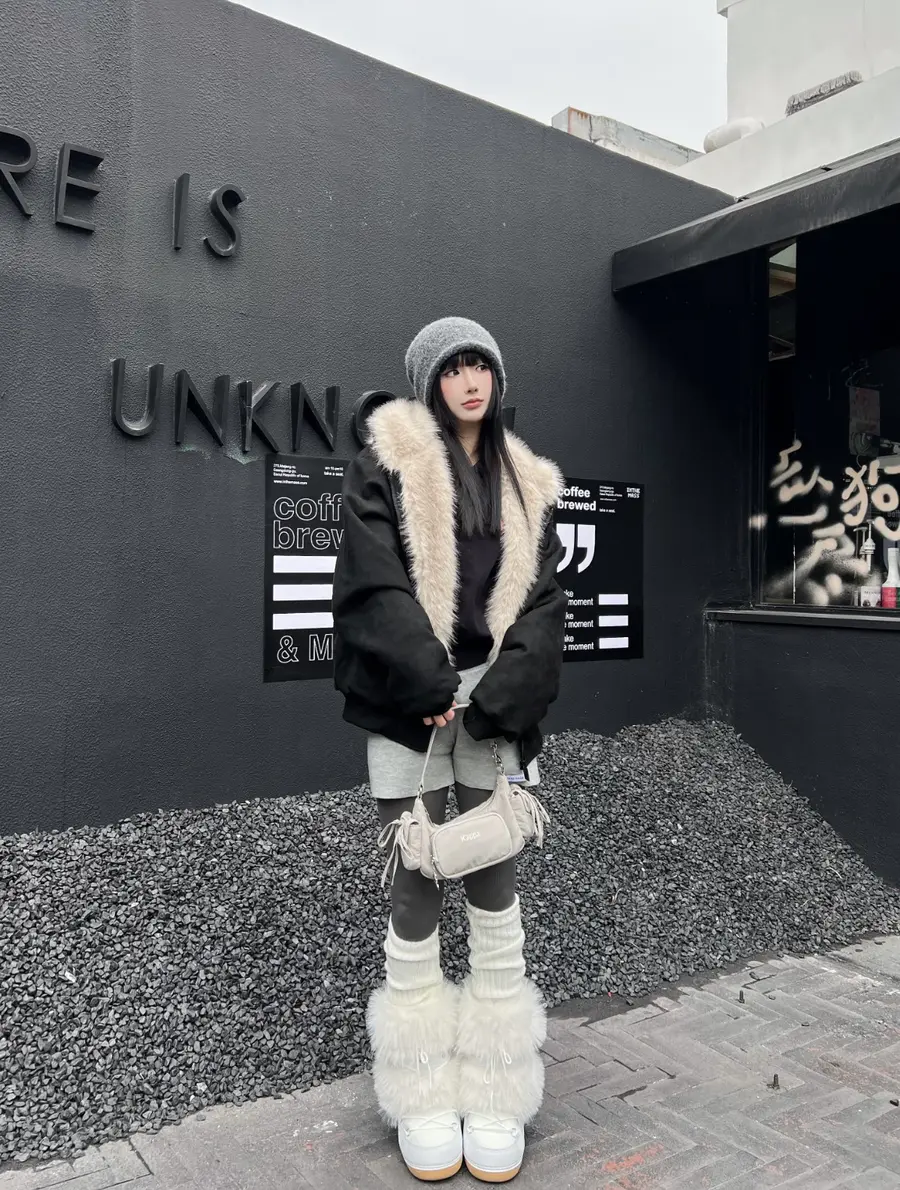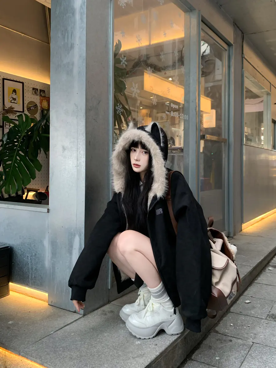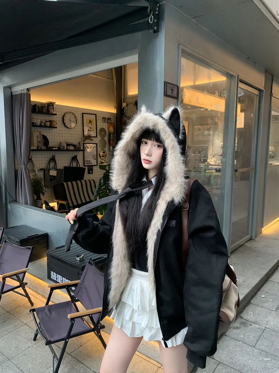 大毛领软乎乎的温暖和安全感直接拉满,耳朵小设计自带酷感,搭配白色蛋糕短裙好乖好甜~