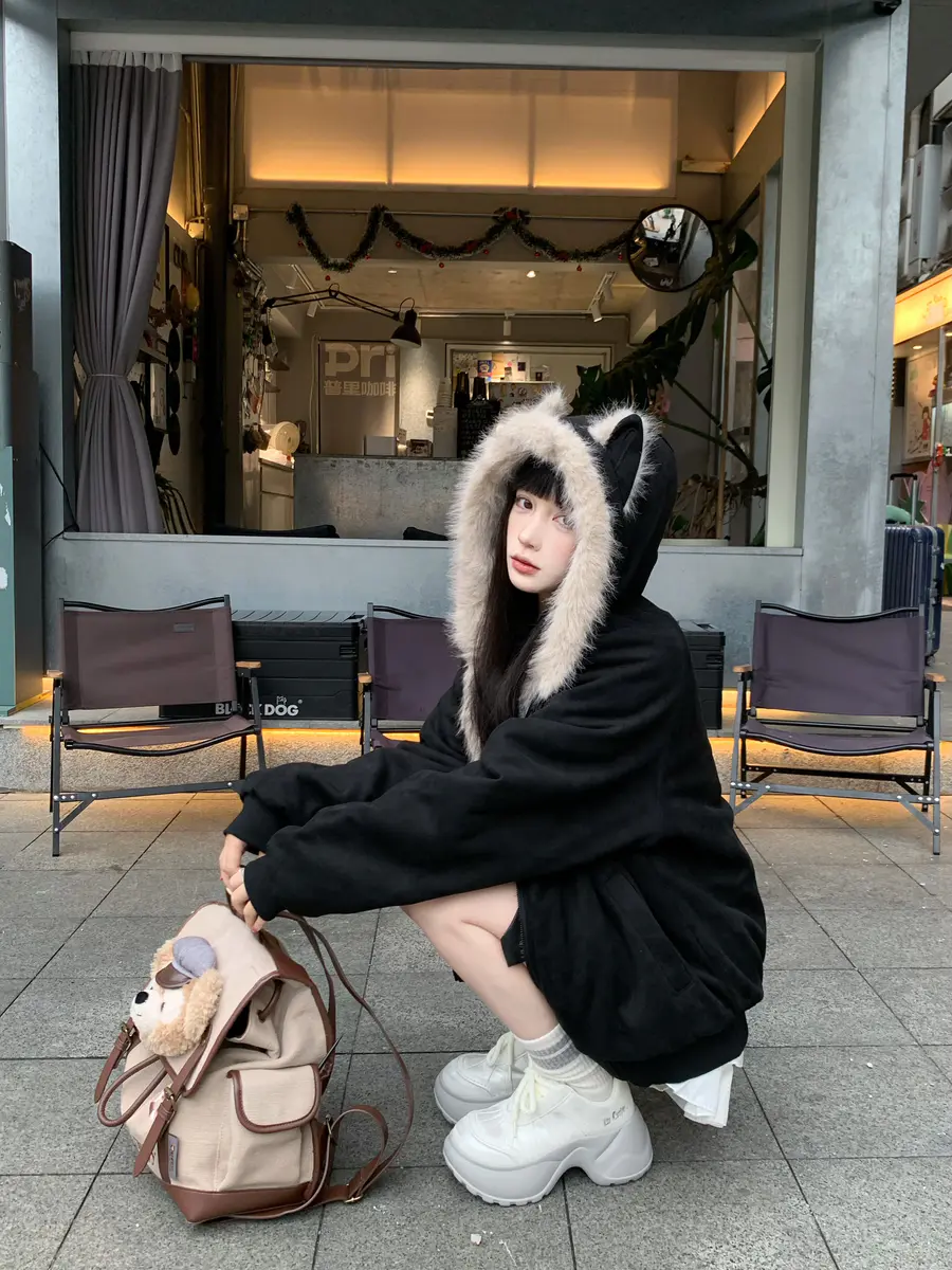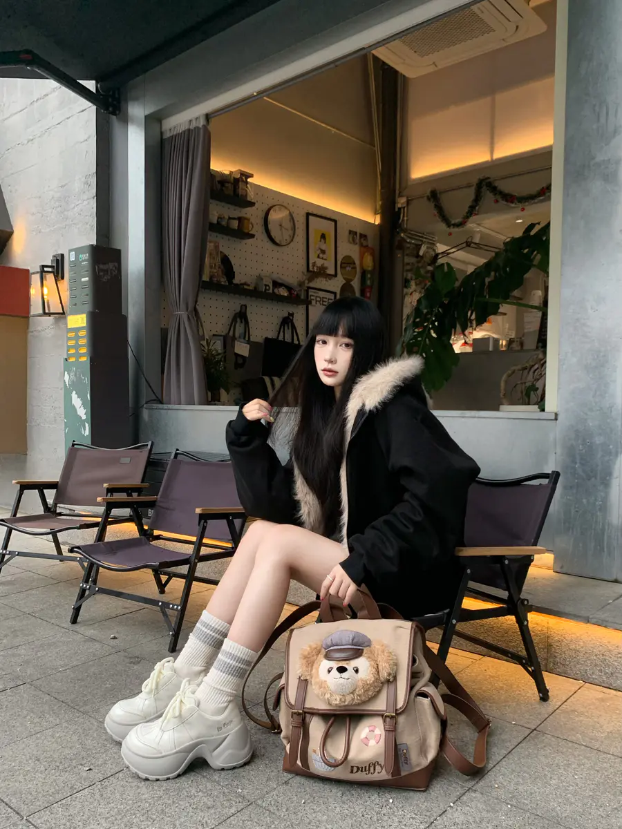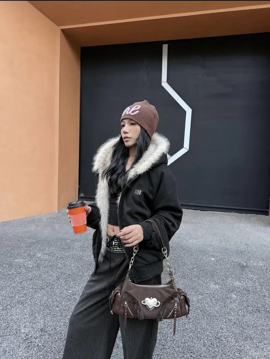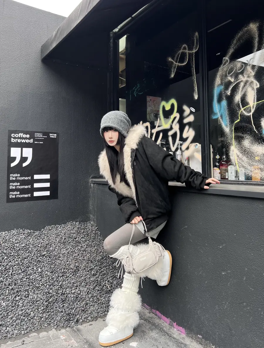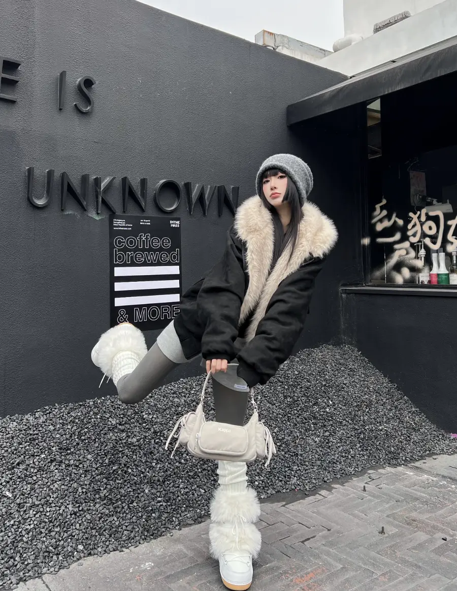 大毛领软乎乎的温暖和安全感直接拉满,耳朵小设计自带酷感,搭配白色蛋糕短裙好乖好甜~