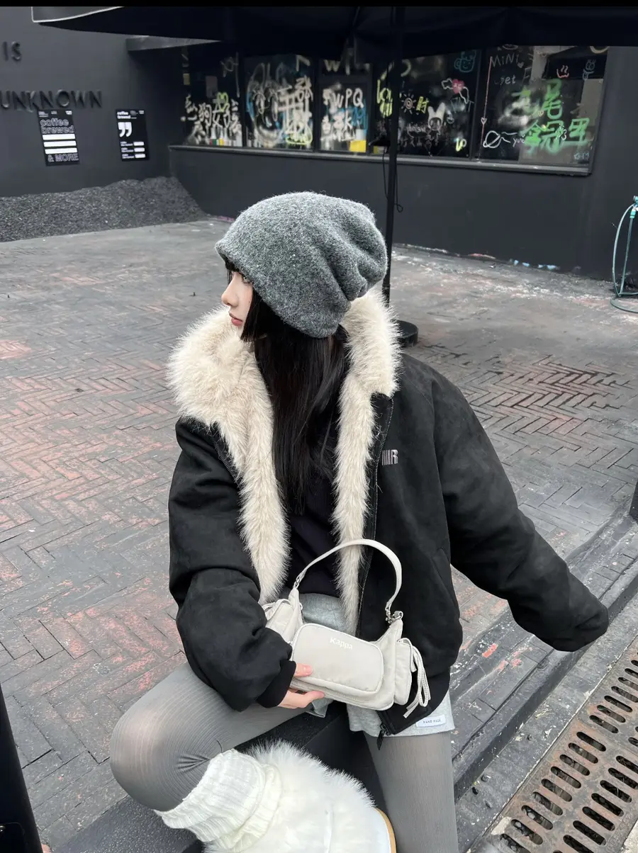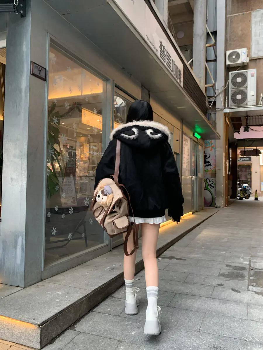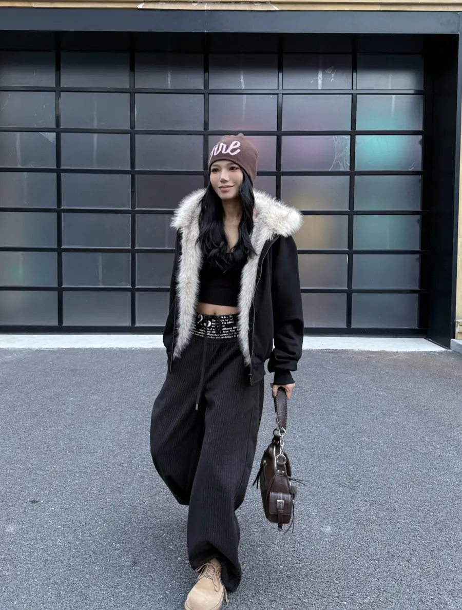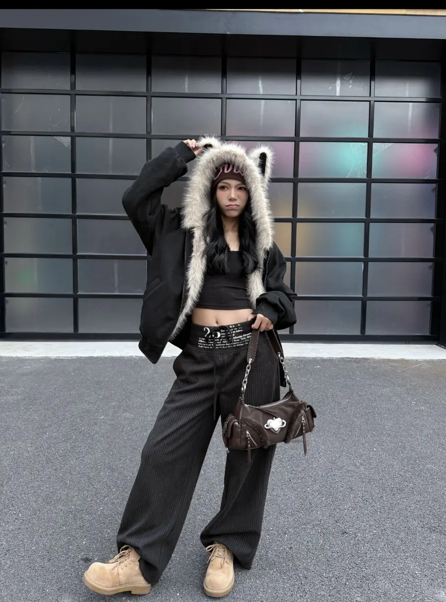 大毛领软乎乎的温暖和安全感直接拉满,耳朵小设计自带酷感,搭配白色蛋糕短裙好乖好甜~