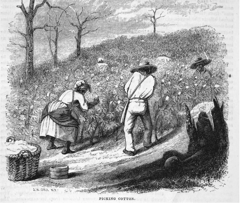 书中插图:在路易斯安那采棉花。此图绘于1853年,描绘的是黑人男女拼命摘棉花的情景。