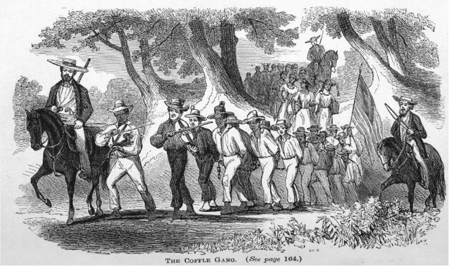 书中插图:奴隶队伍正在向南方和西方前进。男人们被一条长链子拴在一起,手被绑着,女人们跟在后面,守卫跟在旁边。